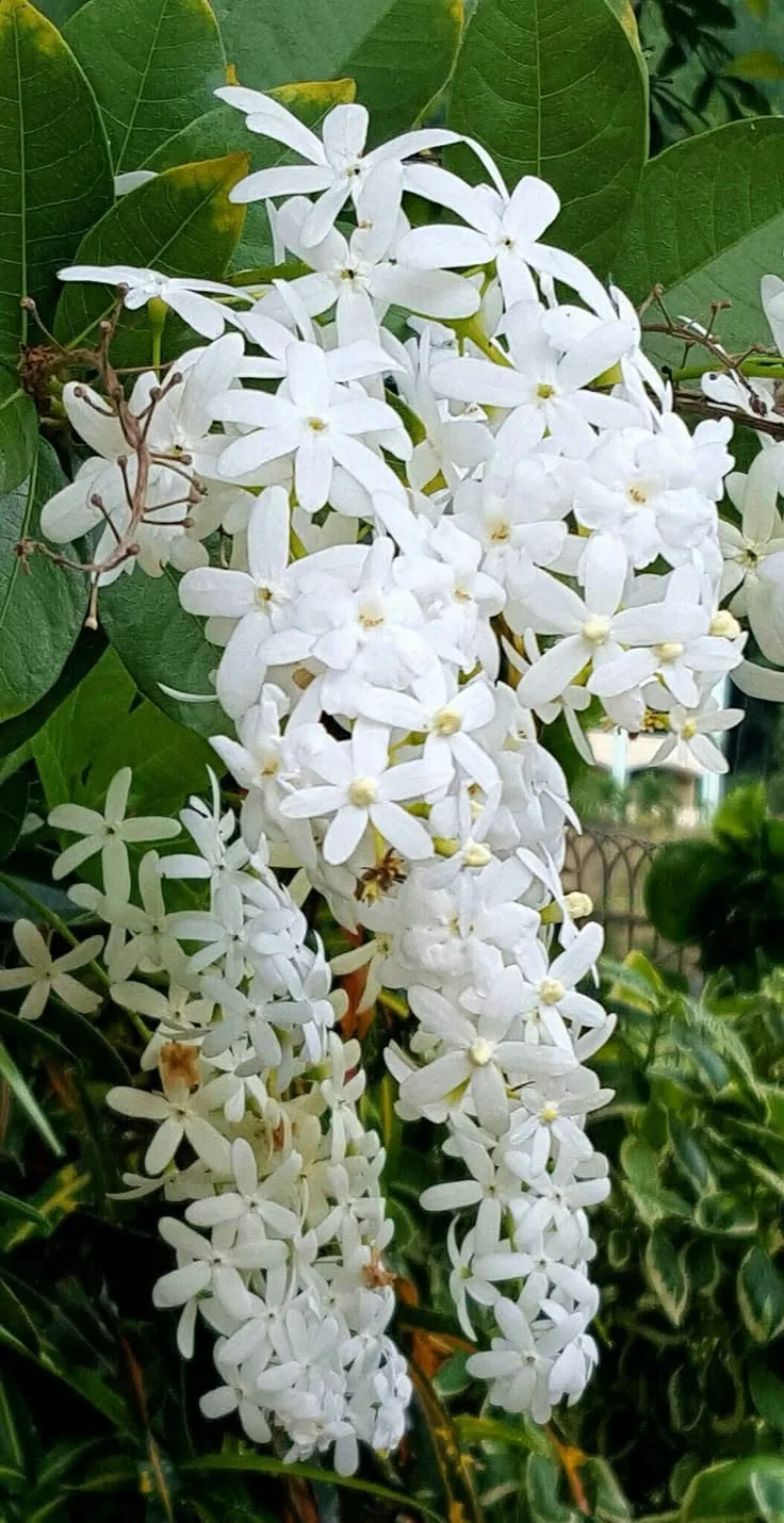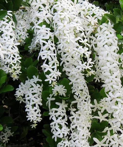 Petrea volubilis white is a vigorous, woody evergreen climber known for cascading, 1-foot-long racemes of star-shaped white bracts that bloom in spring.
